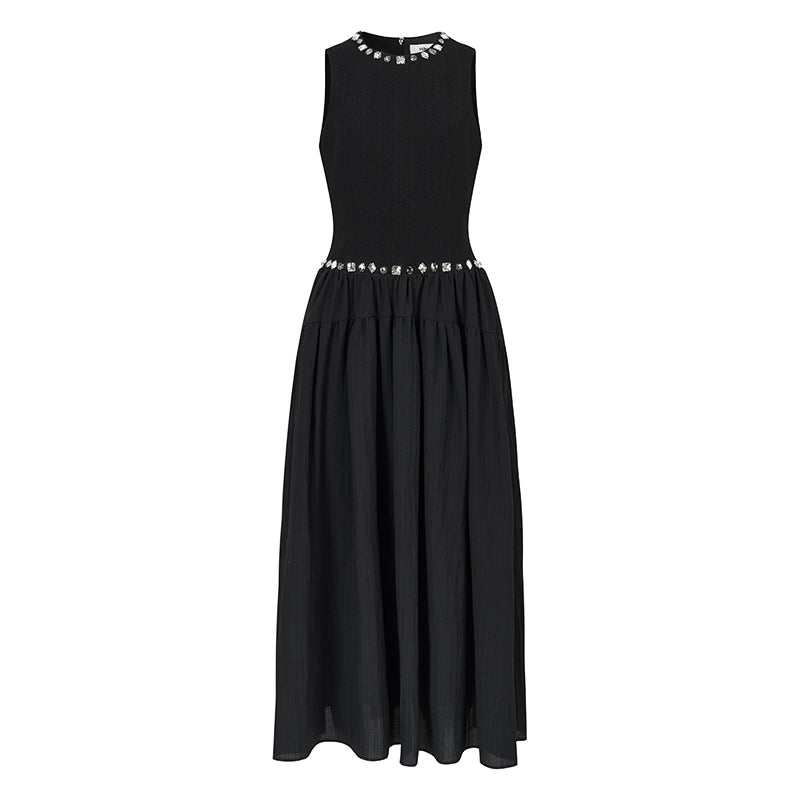 - Black: The neckline and waist are decorated with multi-sized hand-sewn diamond ornaments, which not only create a harmonious and unified color scheme but also add some highlights. White: The neckline and waist are designed with a superimposed vacation webbing, making the upper body light and full of holiday feel.
