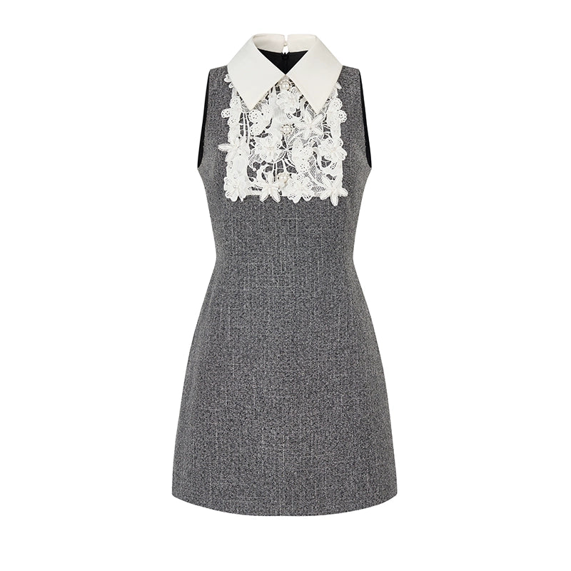 - The chest is decorated with three-dimensional and heavy lace fabric and flowers, which are dotted on the grey body fabric. The faint grey and white complement each other, creating a high-end and layered look.